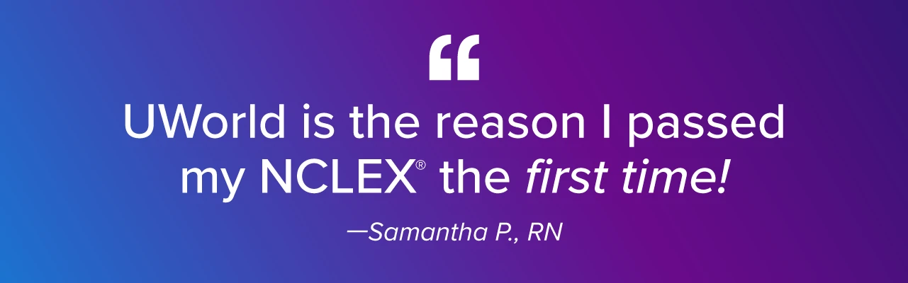Using the study plan along with the self-assessments helped me be very effective in passing my NCLEX. It generated a plan that was very easy to follow, and I took my self-assessments close to my exam date. UWorld predicted I had a very high chance of passing, and the NCLEX just informed me of the same thing. Thank you, UWorld!"